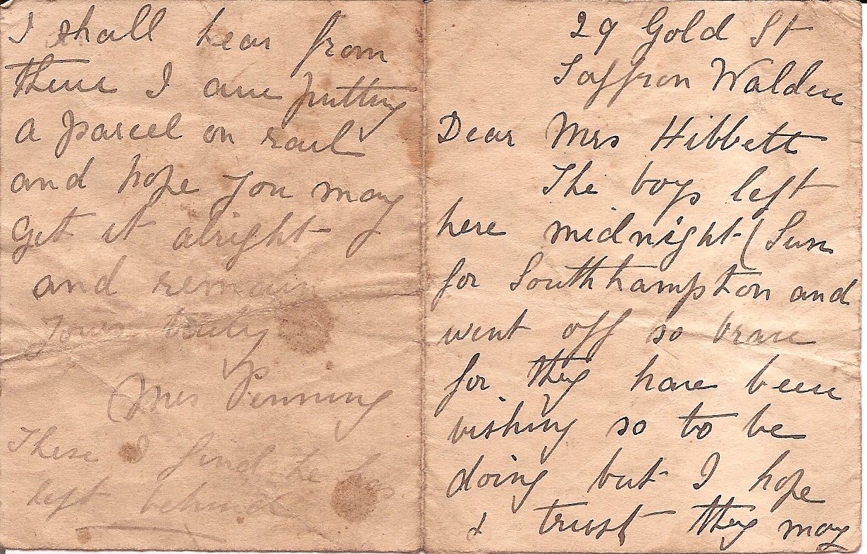 The handsome tin comes in useful & we keep Harold’s things & Miss K.E.Brookes* things in, they just fit. You will be pleased that Sid, Vernon and I were together in the trenches last Tues. night & we are in this loft now with the majority of QMS boys, Norman Cope*, Cecil Jackson*, A.E. Brown*, Jones*, Cyril Hind* etc.