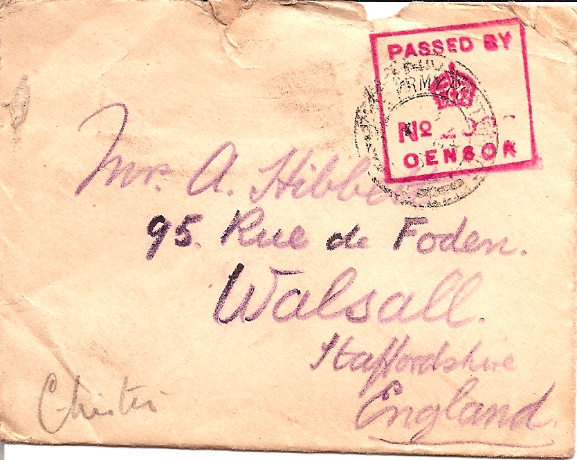 Pte BERTIE HIBBETT: LETTER to MOTHER, 95, Foden Rd, Walsall.