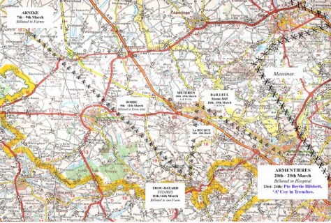 25th March, 1915. Marched 10.00 am to return to old billets near Bailleul & Meteren, arrived about 1.00 pm. GOC NMD witnessed march thro’ Bailleul as also did GOC III Corps (Compliment). (1)