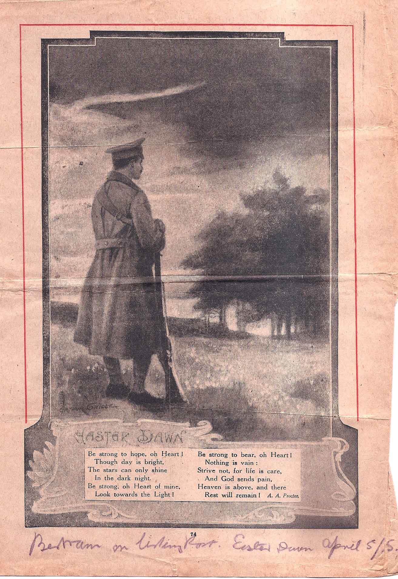 (4) Image: Easter Dawn: Church Magazine Home WordsLtd 11 Ludgate Square. (Vol. XLV. No. 4. April, 1915). ‘ NBEaster Day,1915 was actually 4th April. It is likely that Bertie saw this picture only after he came home and wrote ‘Bertram on Listening Post. Easter Dawn. April 5th/ 15.’