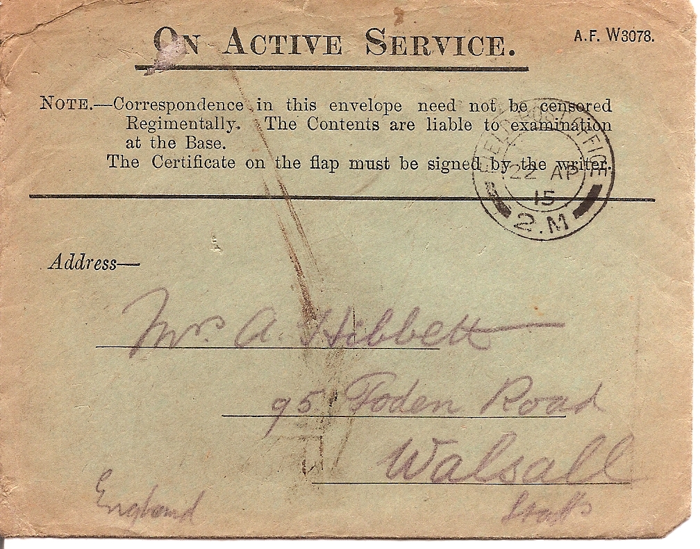PTE BERTIE HIBBETT LETTER to sister IDA HIBBETT, 95, Foden Rd. Walsall.Friday April 23/ 15 (White envelope, Post Date 27th).