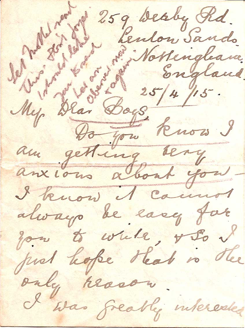 NEXT POST: 25th APRIL 1915. Letter from Godmother Mary Foster, Fernleigh, Nottingham.