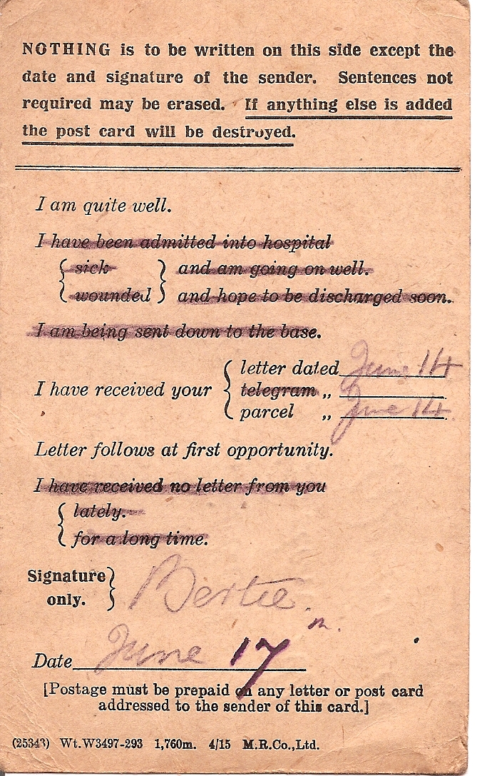 PPS To let you know we got everything & enjoyed everything I say I relished the plum cake with its nuts. The bit of cash will come in handy. I hear the place where we can get something in the way of luxuries has been shelled. The sugar will be sure to come in useful. As a matter of fact the whole jolly parcel was spiffing. The tomatoes arrived quite whole in a splendid condition.