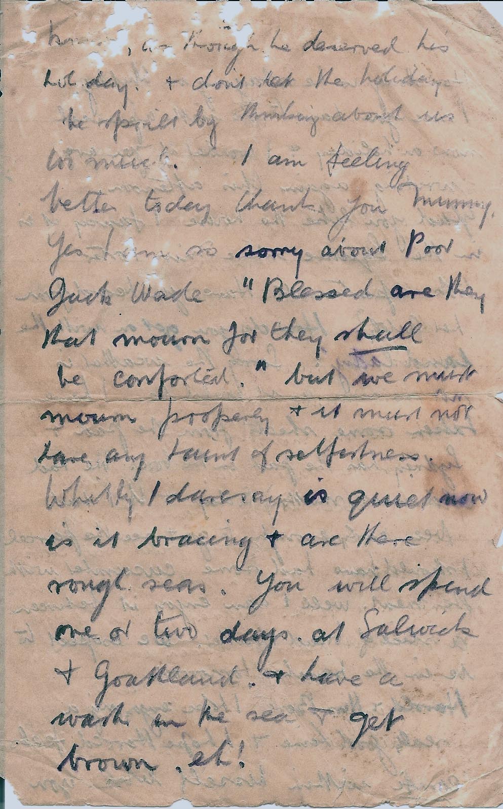 Don’t let the holiday be spoilt by thinking of us too much. I am feeling better today thank you Mummy. Yes I am so sorry about poor Jack Wade. “Blessed are they that mourn for they shall be comforted” (3) – but we must mourn properly & it must not have any taint of selfishness .