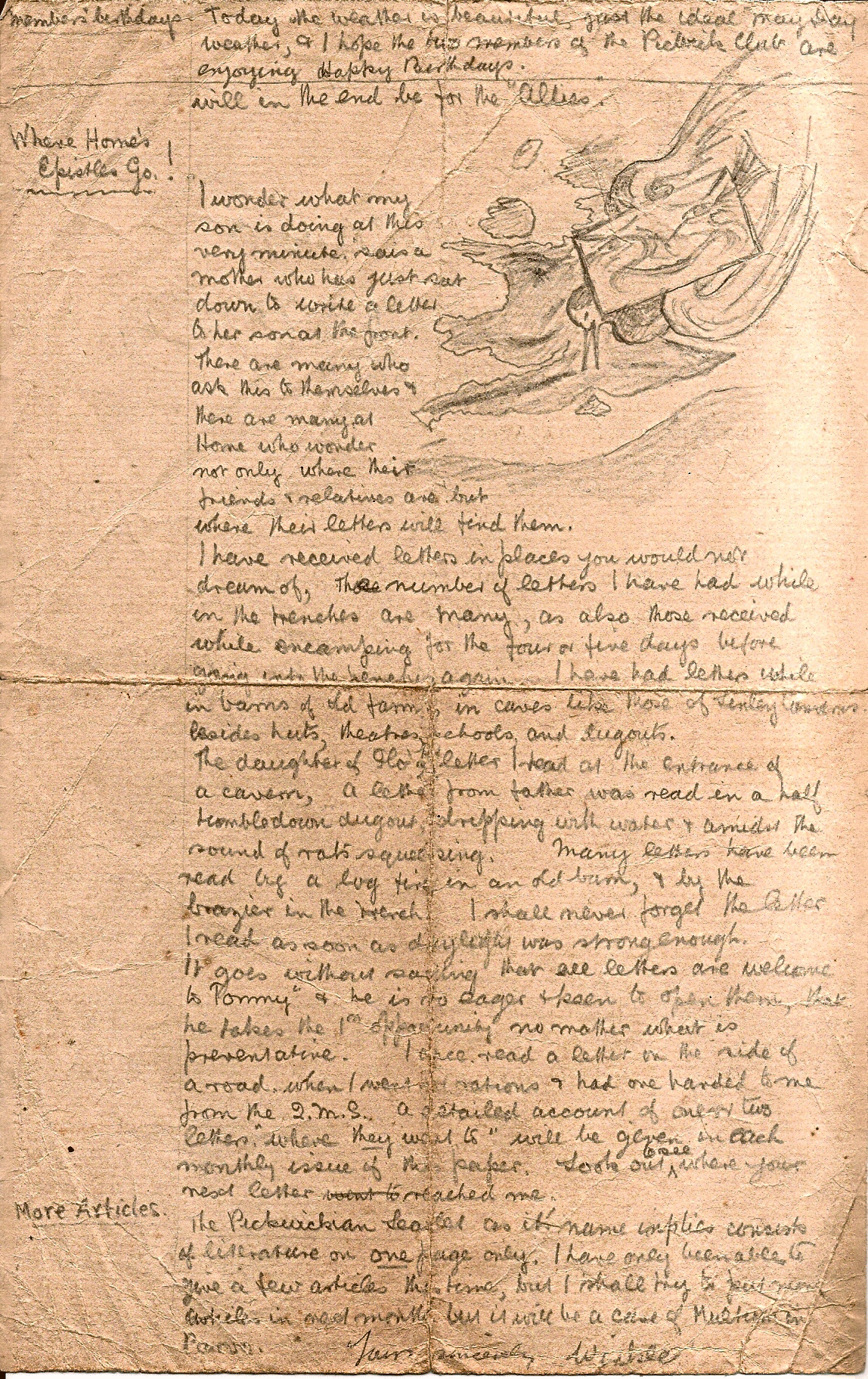 You will recognise one or two of them as copies from Fragments of France. One of the Snipers had it sent to him. The features in my pictures are similar to Bairnsfather’s. What do you think of the verses? I wrote to Miss Bore* last night & sent her a copy.