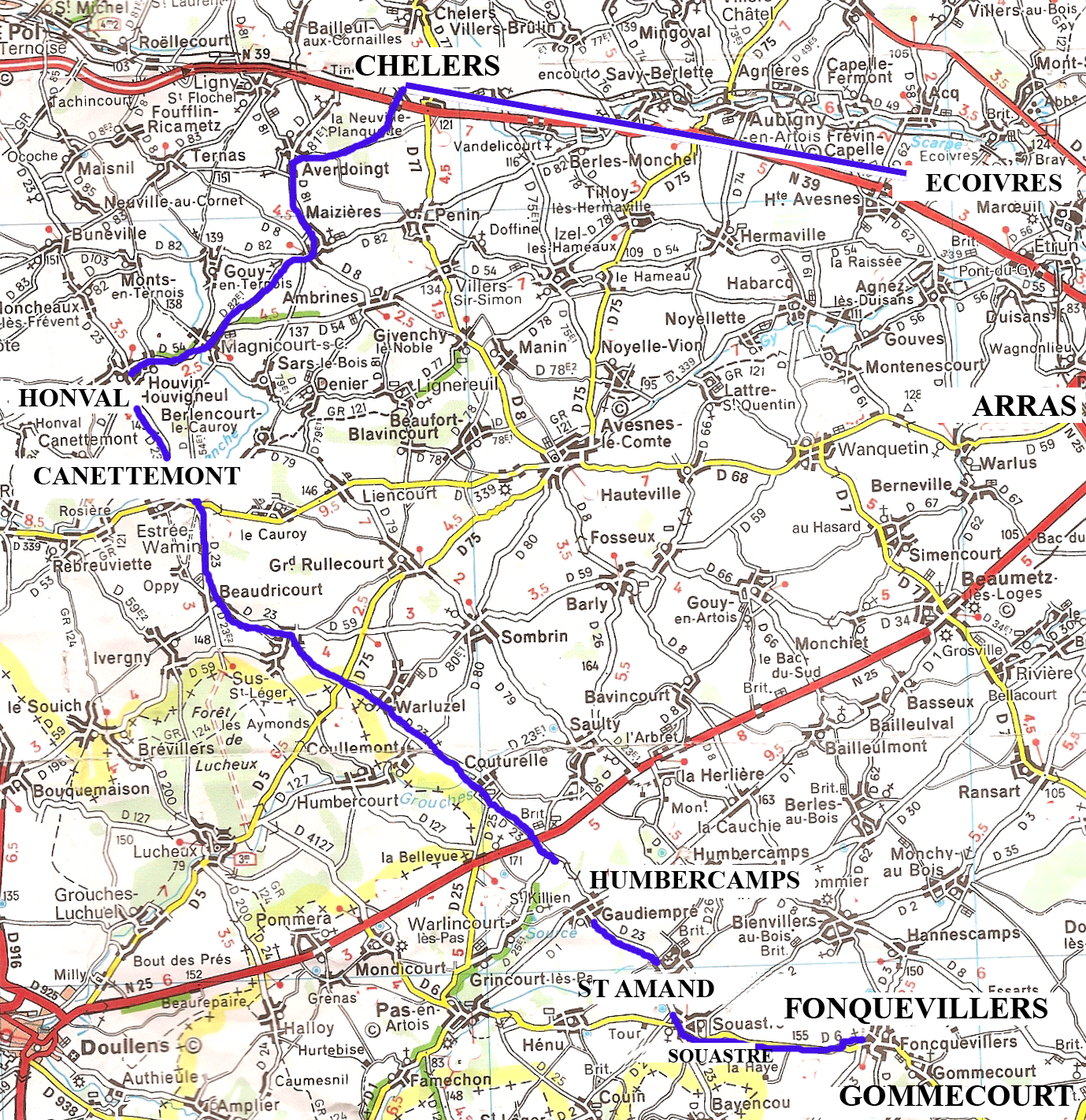 (1) Lucheux: medieval village, approx.13 miles from the Front. Place for rest & training – with a 48th Field Ambulance (37th Division) Hospital. Here the 137th (Staffordshire) & 138th (Lincoln & Leicester) Brigades (46th Division) created a large scale model of German Lines at Gommecourt for Battle Practice. French farmers called the 46th Division ‘Les autres Bosches’ for taking up valuable arable land. Lucheux Woods were exploited for cutting sapplings for hurdles & ‘revetments‘ (trench supports). See Gerald Gliddon: Somme 1916 A Battlefield Companion. 2012.