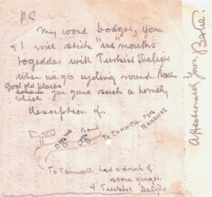 You remembered it seemed, that I love those ginger cakes with icing on top. Are they any dearer now? Bates* used to have them for lunch & send me to Pathesons (5) for them. Many thanks for the favourite chocolates & the very acceptable and ‘suitable’ lime juice pastilles; both Dodger & you still remember what I like in confectionery.