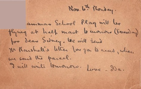 The Grammar School Flag will be flying at half mast tomorrow (Tuesday) for dear Sydney.  We will send Mr Marshall’s letter for you to read, when we send the parcel.  I will write tomorrow.   Love – Ida.