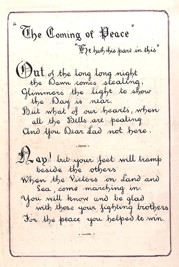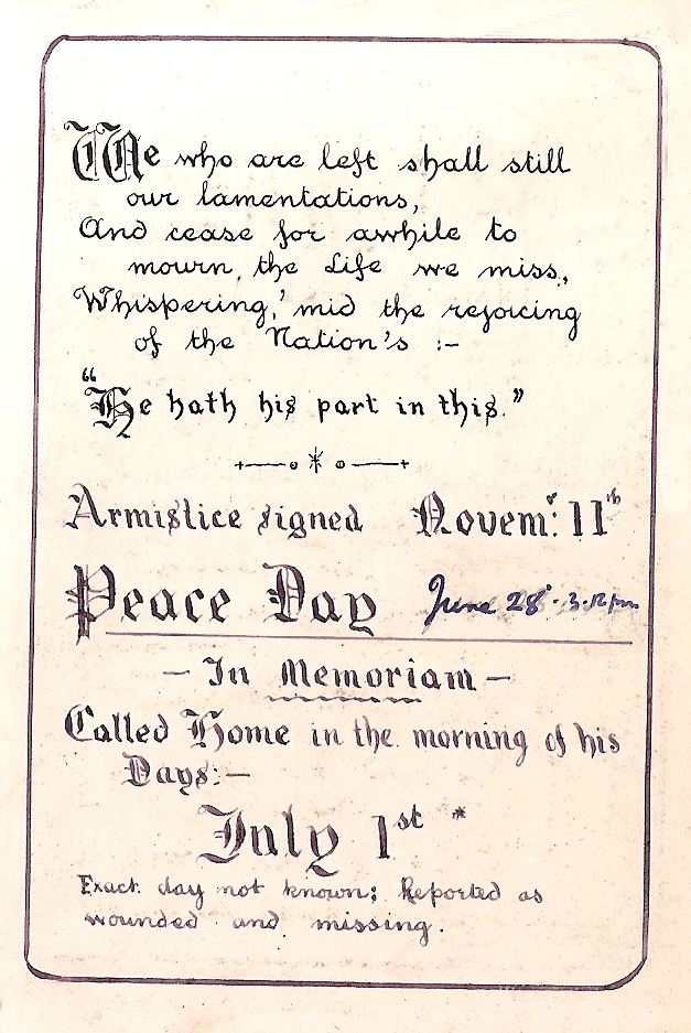 Armistice signed Novem’. 11th. (1918).  PEACE DAY June 28th 3.12 pm (Ed. 1919 at Treaty of Versailles, exactly 5 yrs after Assassination of Archduke Ferdinand).  In Memoriam. Called Home in the morning of his Days:- July 1st 1916. * Exact day not known; reported as wounded & missing.’