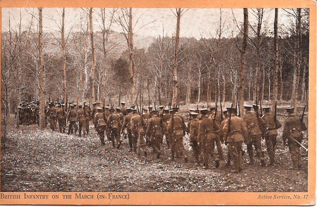 Postcard: British Infantry on the March (in France) : ‘Published by PHOTOCHROME CO LTD, London & Tunbridge Wells “On ACTIVE SERVICE” BY AIR AND SEA. From Copyright Photo taken at the front’.