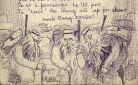 It was while I was making this sketch that I was amazed to see some very old German soldiers, with long white beards, using mechanical excavators in their front line, and making great loads of earth fly up in the air. I also spotted a dead cow’s head, which I presumed was used as a German sniper’s post. I feel pretty sure that it was from there that our parapet was peppered with German bullets whenever I attempted to put up my periscope. “Keep away from Hibbett and his periscope !” was the general cry.