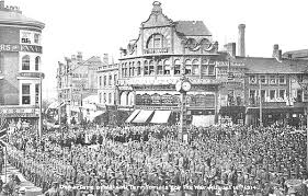 ‘As sorrowful yet alway rejoicing!’ (11) – how we rejoiced to see Southampton – and from the railway carriages, what a sight it was to see all the men, women and children; all waving Union Jacks from their back gardens for miles along the line to Birmingham. When we neared our home town of Walsall we Staffordshire boys thought we would be detrained at Birmingham station, but no, we remained in locked carriages and a rope, stretching all along the platform, kept people away. Nevertheless people threw packets of fags and boxes of chocolates, and other articles of food, towards those soldiers who could get to the windows.
