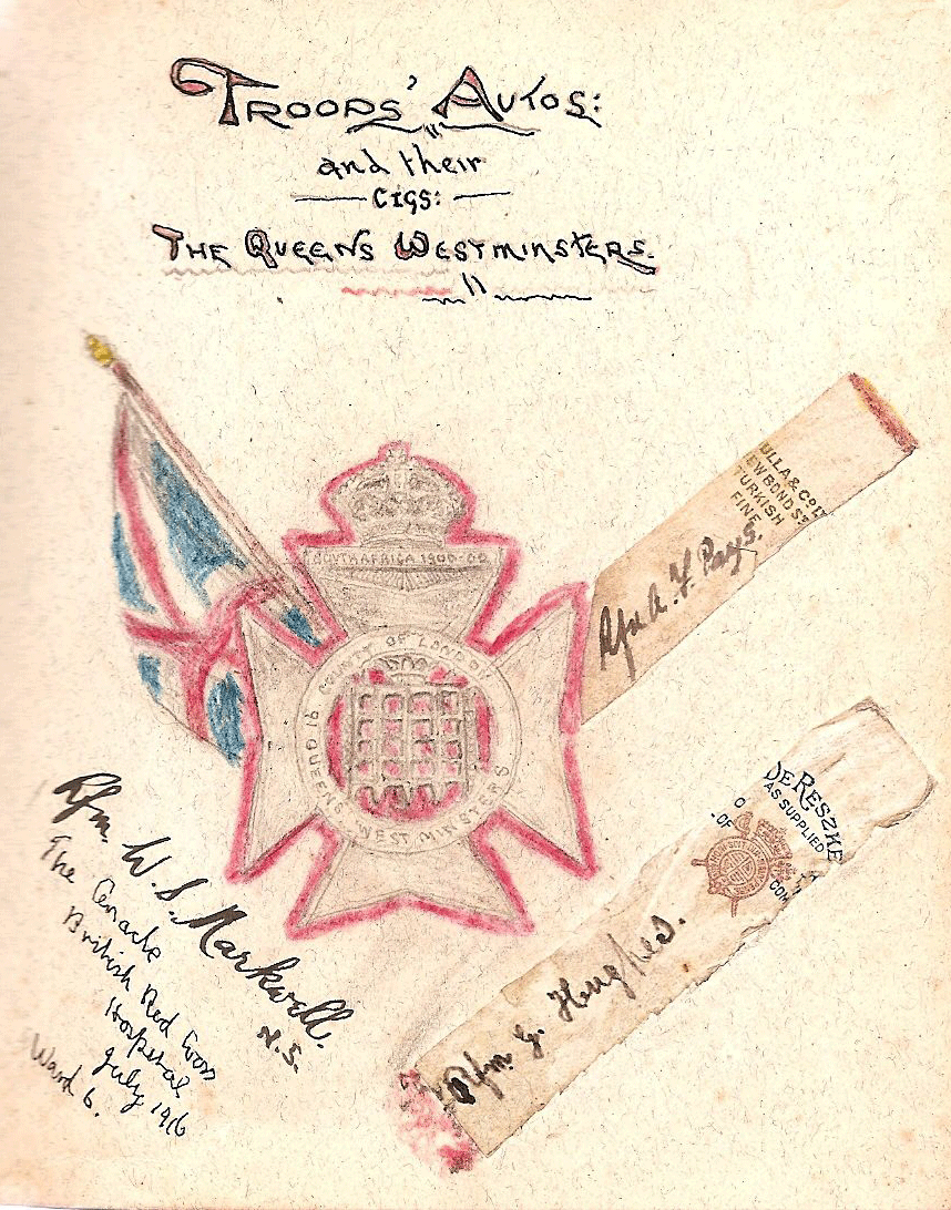 My pal, Vernon Evans*, gave me an Autograph Book in which I collected autos of the patients, written on cigarettes, which I cut in half and pasted on the pages.