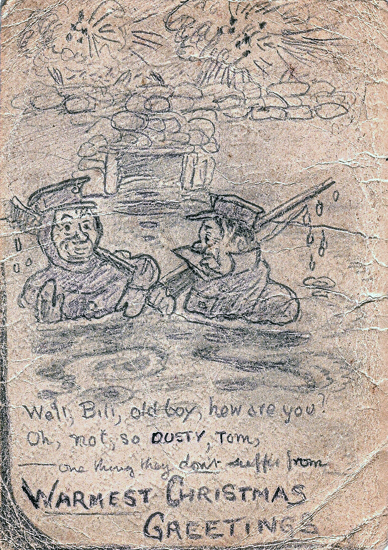 I got lost in the confusion of the bombing. I got to where I believe was the point our Front Line faced the German enfilade trench I had sketched in the days before. There to my amazement I saw British soldiers lying close on the floor of the trench, like sardines in a tin; some dead and some dying with groans. A sergeant called out to me from a dugout: “Come in here or you will soon be like those lying there.” To my lasting remorse I was forced to tread on the bodies of those poor men.
