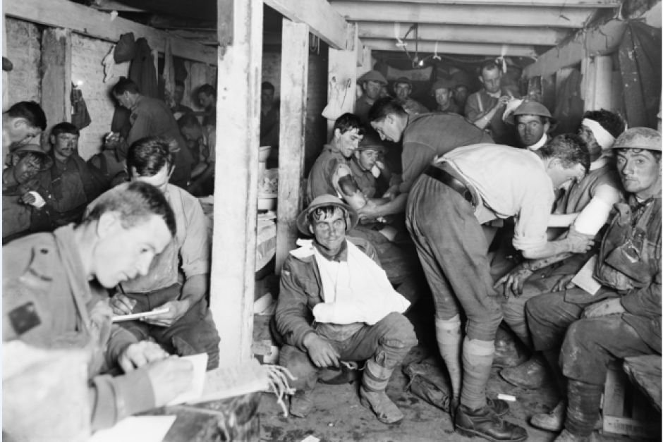 (2) Aid Post in the Line: the first in a chain of medical posts organised by the Field Ambulance (FA). The FA Bearer Division brought wounded from the Front Line Regimental Aid Post (RAP) to a Casualty Clearing Station (CCS), then on to a Main Dressing Station MDS (Tented ‘Hospital’) for treatment by the FA Tent Division. At the outbreak of war the R.A.M.C. had only 5,000 officers & men.