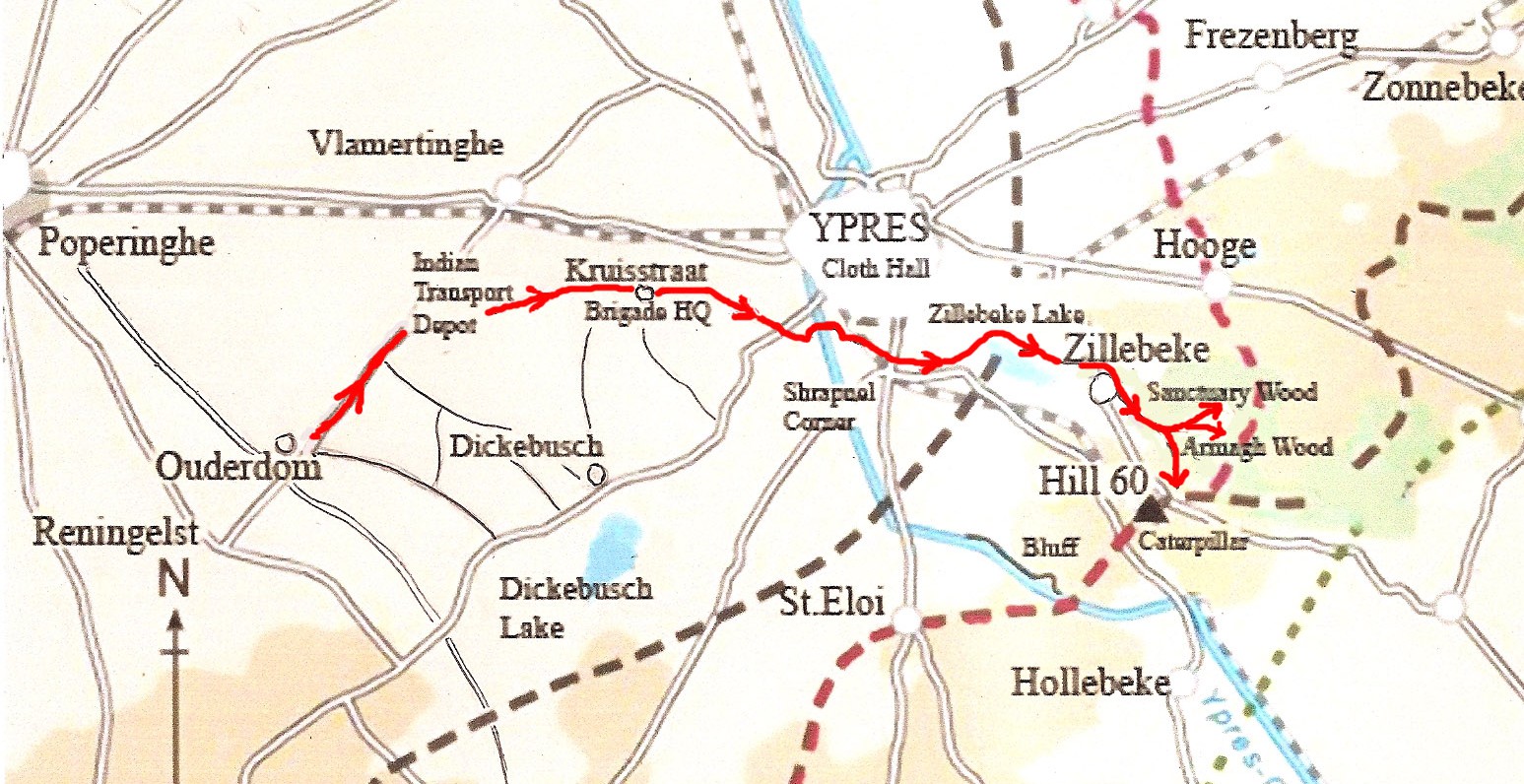 The Staffords with Pte Bertie Hibbett and his brother must have taken the same dangerous route to the Front as the Leicesters, whom they were to relieve on 5th July – i.e. by roads and mud tracks and over the Ypres-Comines Canal at Bridge 14, passed the notorious Shrapnel Corner – and Hellblast Corner (at the southern tip of Zillebeke Lake). Then on over the deadly main road at Zillebeke – before reaching Armagh Wood (next Sanctuary Wood on left & Hill 60 on right). [Source: J. A. Hollis’ 1919 account, based on the 5th Leicesters’ War Diary:<http://bigenealogy.com/leicestershire/salient.htm>