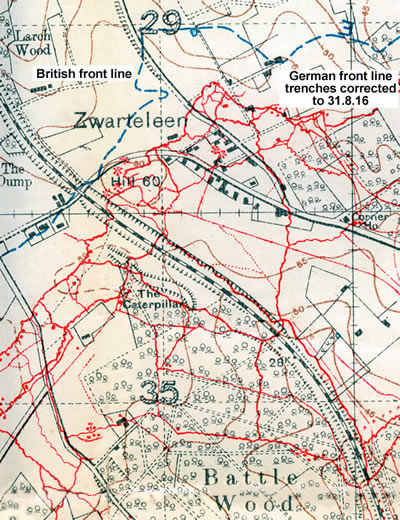 The 1/5th South Staffords battled on holding the Line at Hill 60 and under constant threat of being blown up by enemy mines under Trench 35 ‘Bomb Corner’ 36 & 37. The R.E successfully recovered a total of 1250 Ibs of explosives, black powder and Lignosit from a German mine – and where fumes prevented them from recovering more, they managed to cut the wires leading to the charge, a highly dangerous procedure.